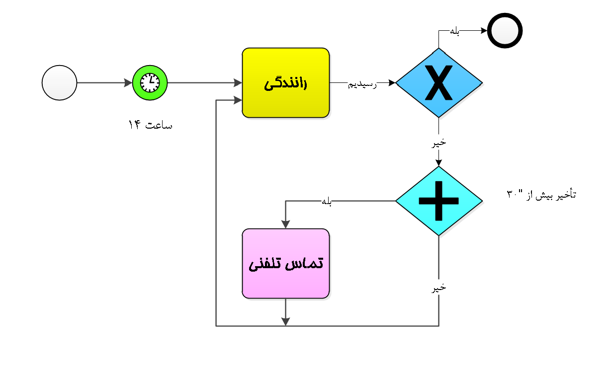فرض کنید در یک خودرو مشغول رانندگی هستید.ساعت 2 با فردی قرار ملاقات دارید .اگر بیش از 30 دقیقه از ساعت 2 بگذرد با اوتماس تلفنی برقرار کرده و زمان بیشتری خواهید داشت.به کمک BPMN این فرآیند را ترسیم کنید.