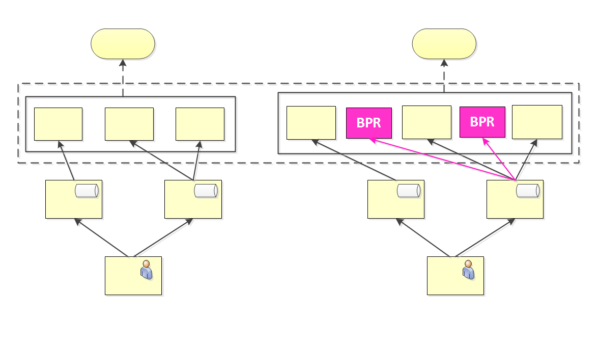 معمار سازمان طرح موجود و طرح مطلوبی را ترسیم نموده است .در این دو طرح بیشترین تغییرات مربوط به فرآیندها هستند. شناسایی فرآیند جدید ، ترکیب آن با فرآیند موجود،اصلاح بخشی از فرآیند موجود و... از اجزاء BPR می باشد.